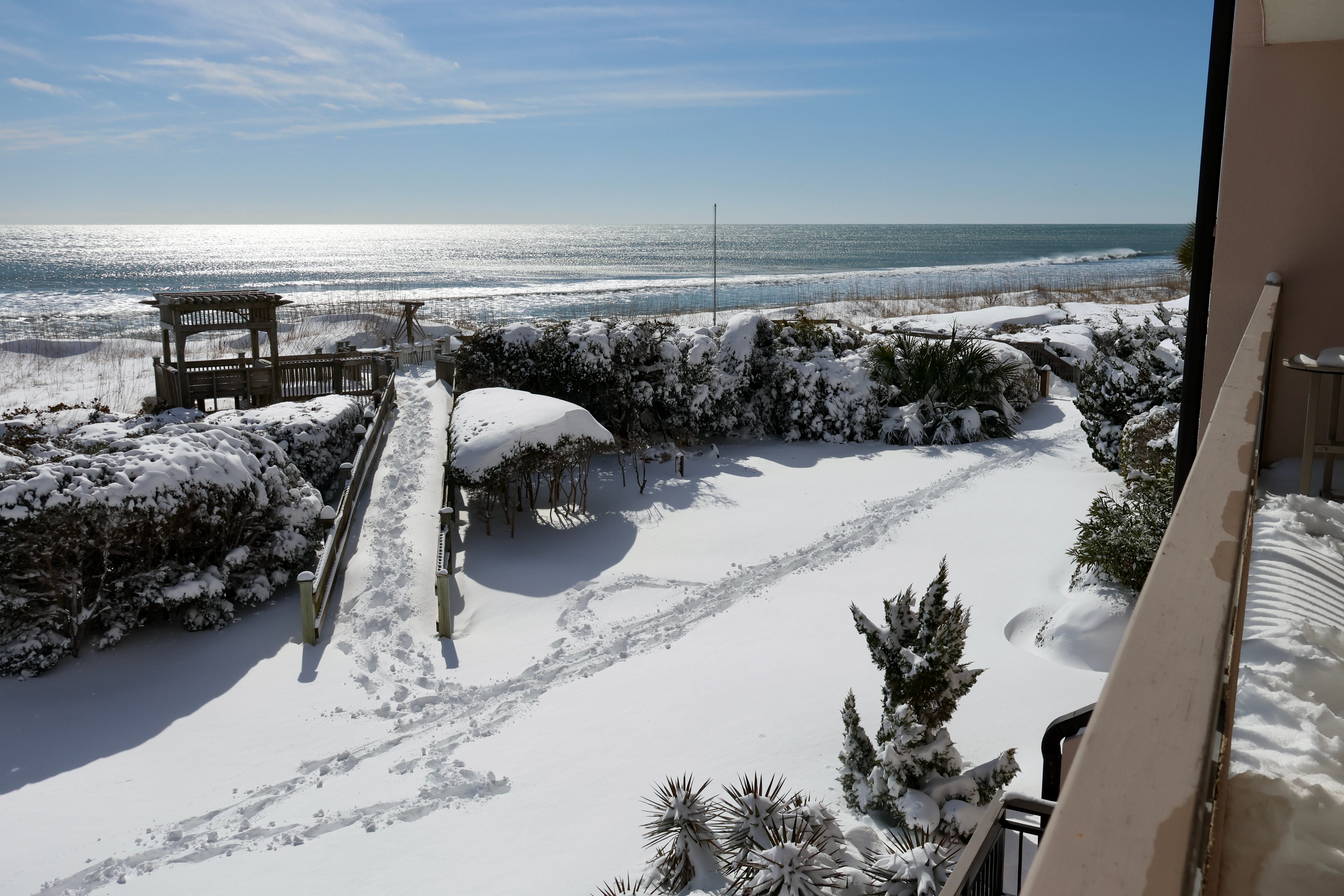 But so will unexpected delight, as in the form of snow at the beach. It doesn’t even snow much in the N.C. mountains anymore, but at the coast we received about a foot of fine, powdery fairy dust on the last weekend in January. It snowed in often whiteout and frostbite conditions from Saturday morning till Sunday morning. A true wonderland was the result, with drifts of three to four feet deep. Fortunately we could enjoy it at our leisure and didn’t have to try to drive it in, and we never lost power.