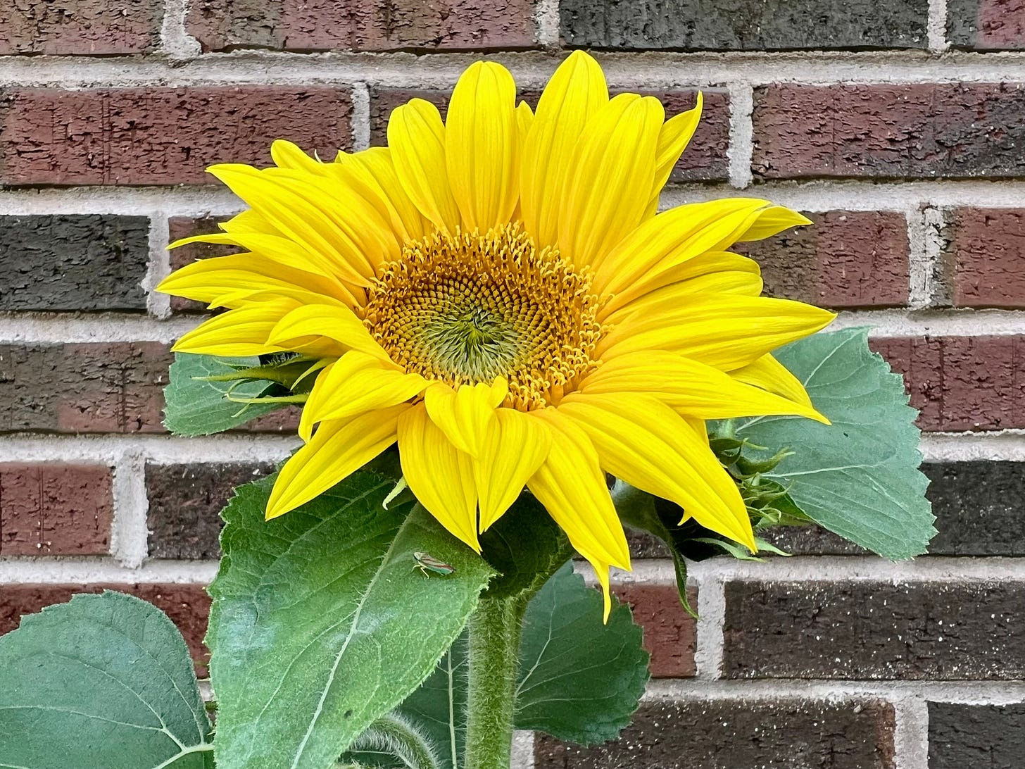 Just off to the left was a for-real sunflower, its thick stalk about my height, with several large buds at the top tucked inside huggy balls of teardrop-shaped petals. I kept an eye on it over the next few days, hoping it would bloom while I was still in town, and sure enough — the topmost flower opened up. I took Dad out in his wheelchair to see it, since it’s not easily visible from within his room. (He was doing okay overall but seemed slightly diminished and less energetic in general, a process that carves new scars into my heart every time I see him.)