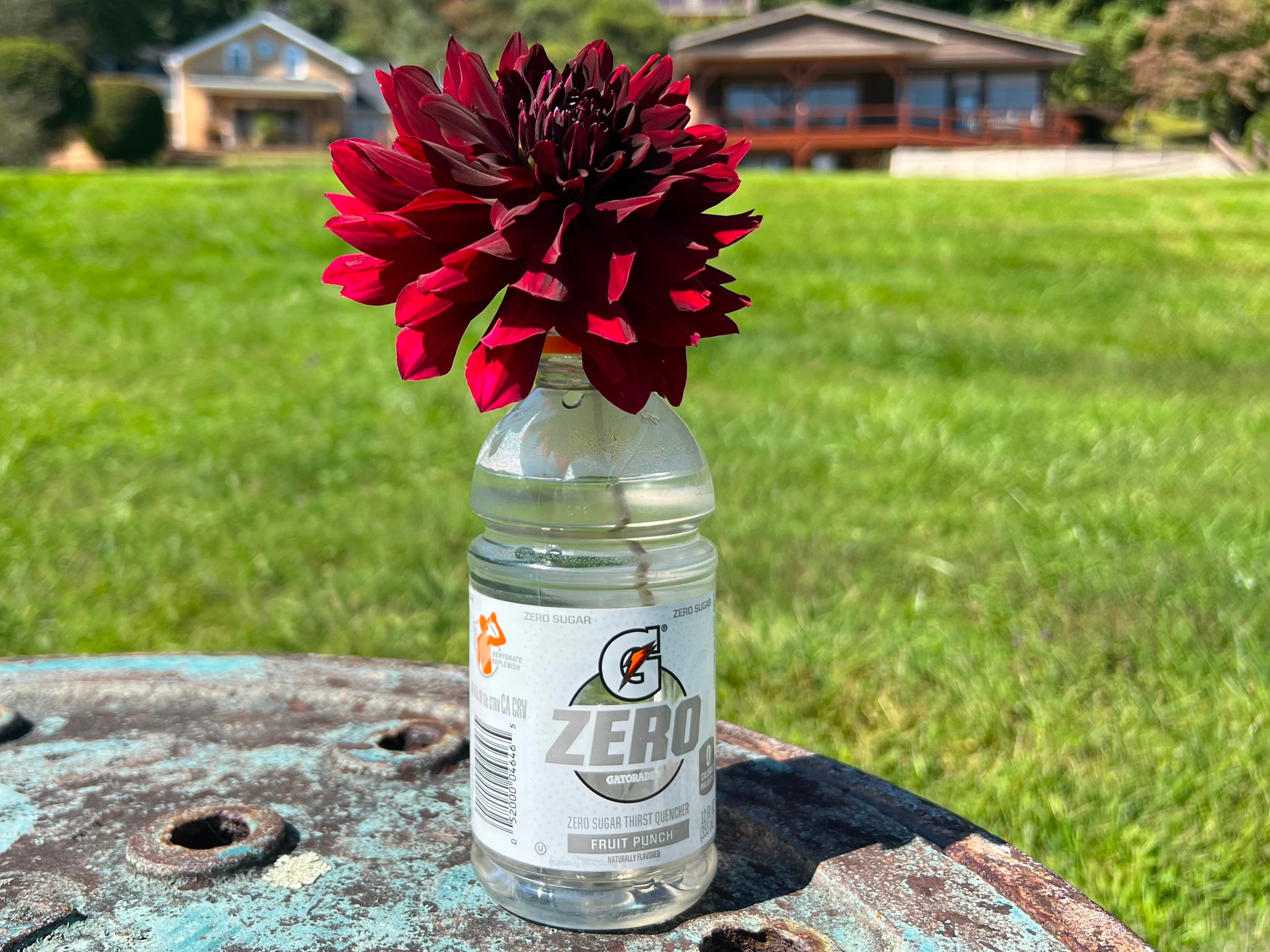 I was tempted to cut the tall nursing home sunflower and take it into my dad’s room, but he declined. I had already cut a smaller one and taken it in, putting it in some water in a plastic orange juice bottle (a la the dahlia from the lake). It was the one among the patch that had sprung up under the feeders — but by then that had all been whacked down by landscapers. I was grateful they’d left the big flower. I wondered why they did. Hardly anyone will see it, but perhaps when it goes (back) to seed, completing its life cycle, birds will enjoy the harvest.